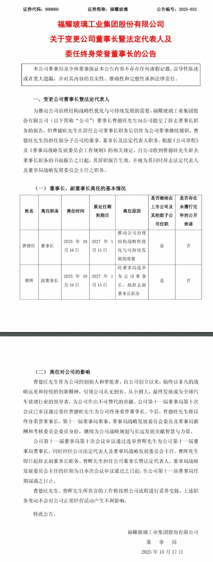 查看詳情福耀玻璃(600660.SH)公告稱(chēng),公司董事長(zhǎng)曹德旺因推動(dòng)公司治理結(jié)構(gòu)戰(zhàn)略性?xún)?yōu)化與可持續(xù)發(fā)展的需要,辭去董事長(zhǎng)職務(wù),但將繼續(xù)擔(dān)任公司董事及部分子公司的董事、董事長(zhǎng)和法定代表人職務(wù)。 同時(shí),公司選舉曹暉為新任董事長(zhǎng),并任命其為法定代表人及董事局戰(zhàn)略發(fā)展委員會(huì)主任。曹德旺被委任為公司終身榮譽(yù)董事長(zhǎng)。此次職務(wù)變動(dòng)不會(huì)對(duì)公司正常經(jīng)營(yíng)活動(dòng)產(chǎn)生不利影響。(財(cái)聯(lián)社)