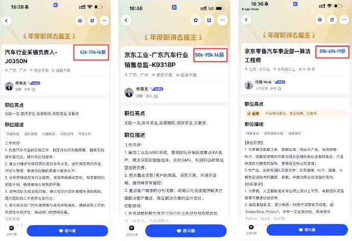 查看詳情10月14日,京東回應(yīng)下場(chǎng)造車引關(guān)注。 目前,京東正在脈脈上招聘多個(gè)汽車相關(guān)的高薪崗位,涵蓋后端開發(fā)、算法、采銷等多個(gè)工種,其中汽車零售事業(yè)部算法崗年薪達(dá)到123萬元,汽車行業(yè)采銷負(fù)責(zé)人年薪高達(dá)110萬元。(鳳凰網(wǎng)科技)